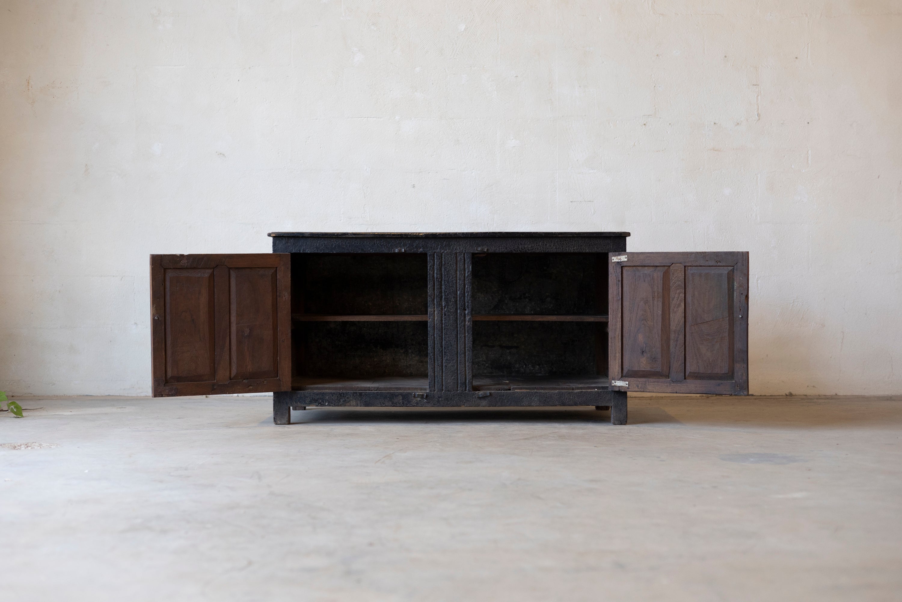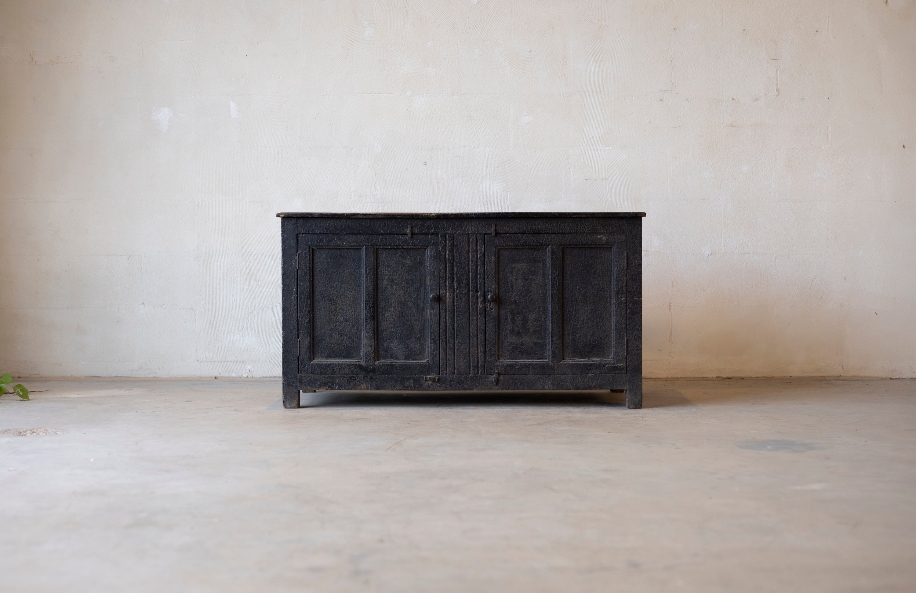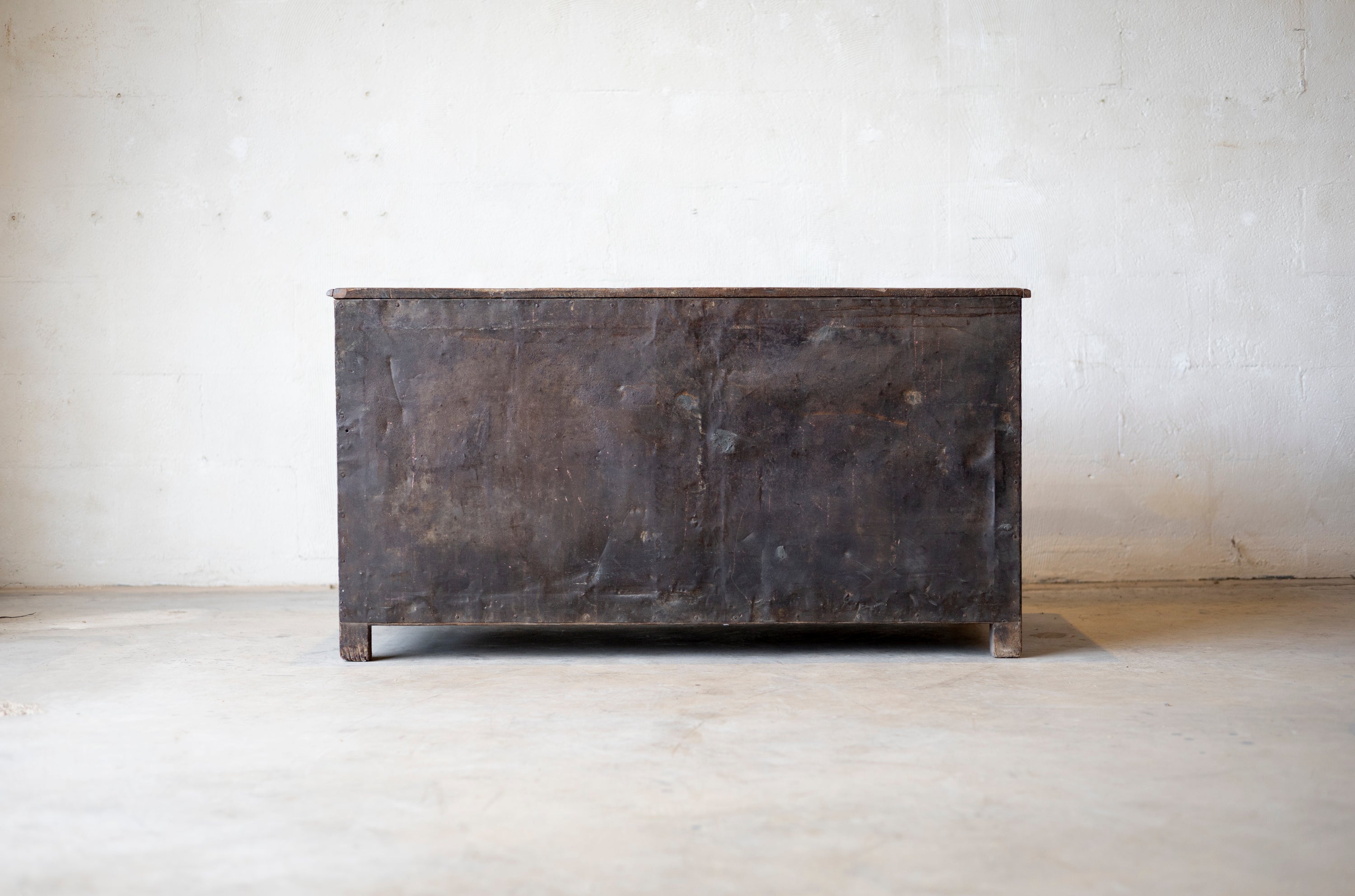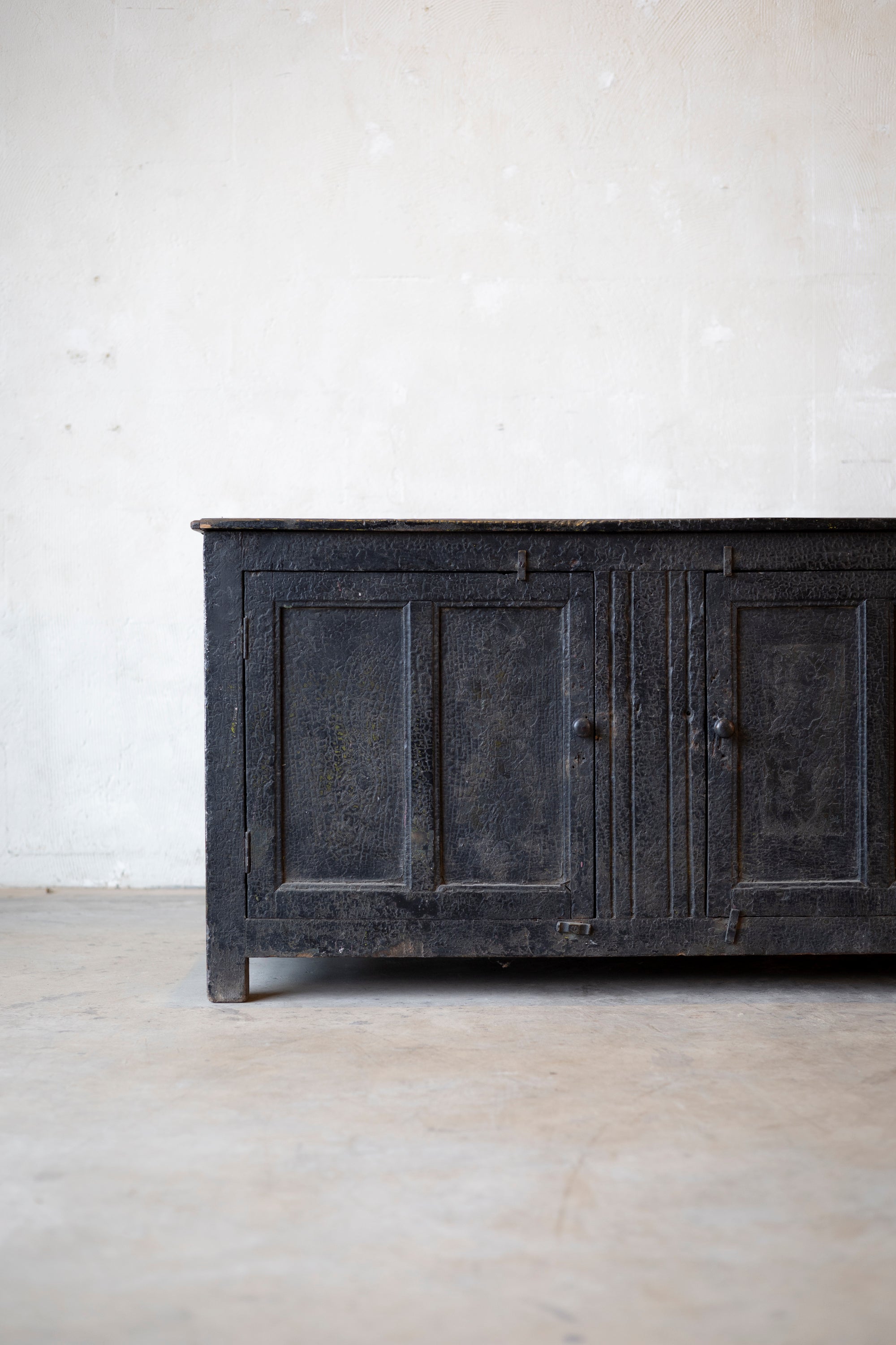 The cabinet features a rugged, utilitarian silhouette characterized by the honest wear of decades of daily use. Its sturdy construction speaks to its hardworking origins, while the natural wood grain has developed a deep, soulful patina over nearly 140 years. Whether used as a unique focal point in a kitchen or as a sophisticated storage piece in a creative studio, this cabinet brings the industrious spirit of the late 19th century into the modern interior.