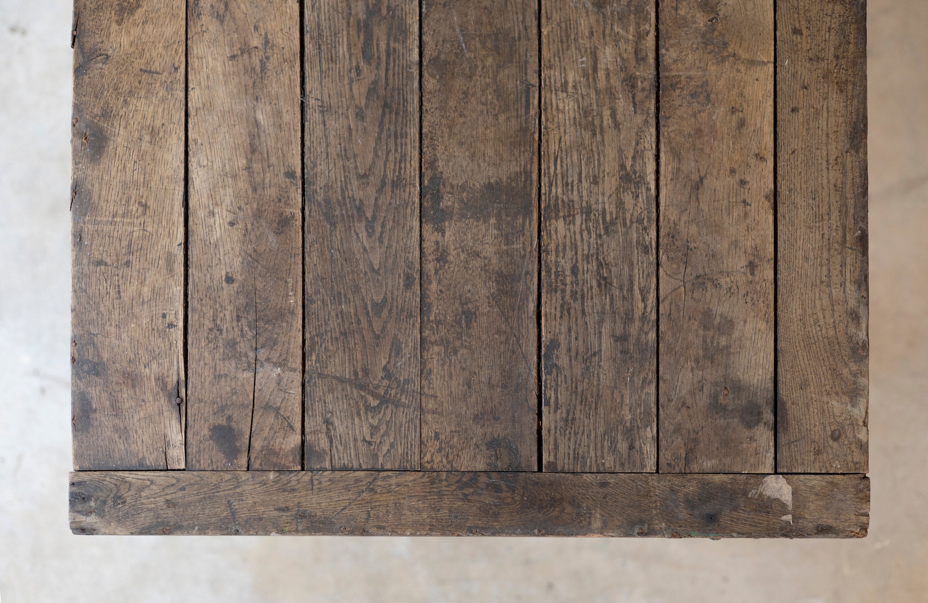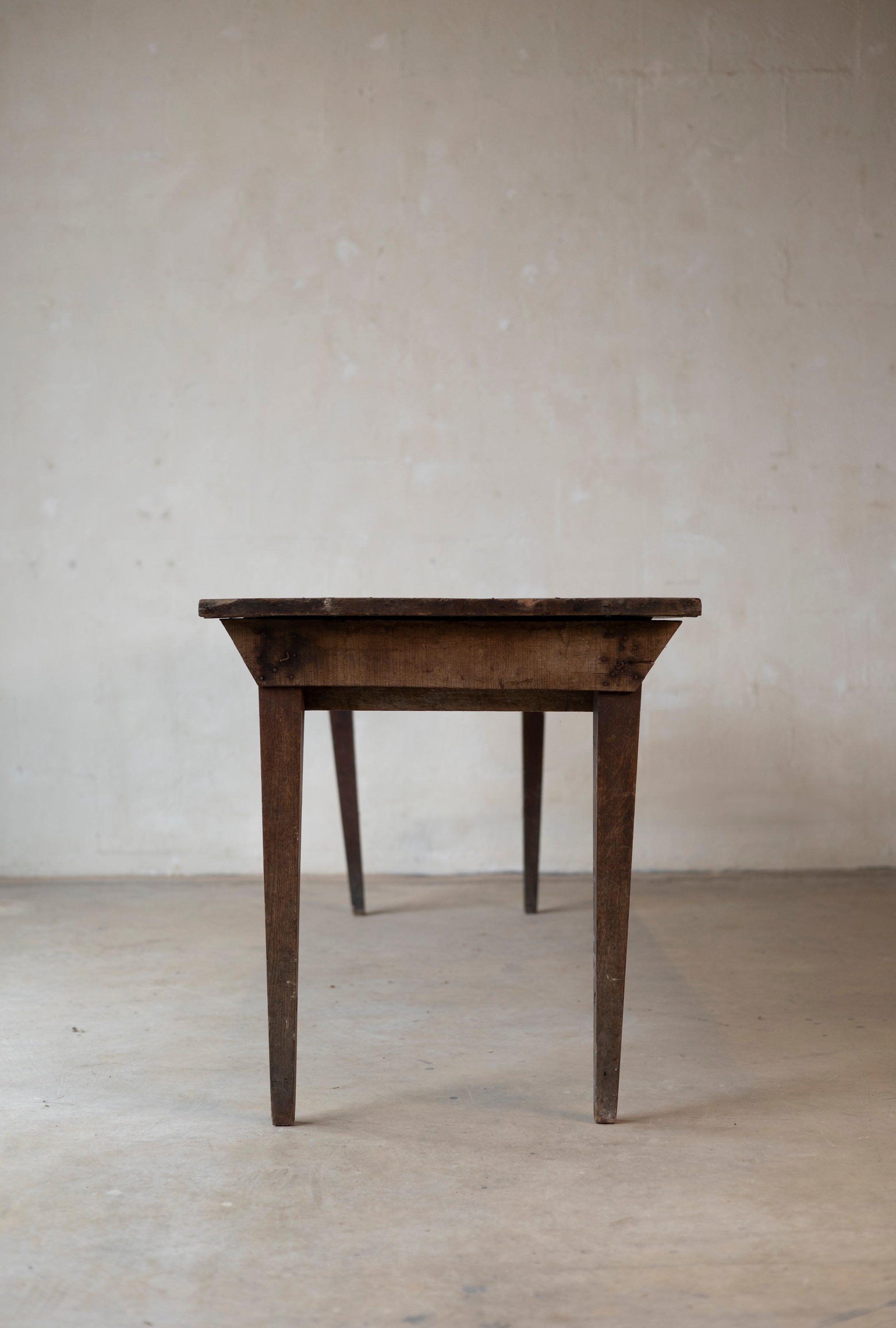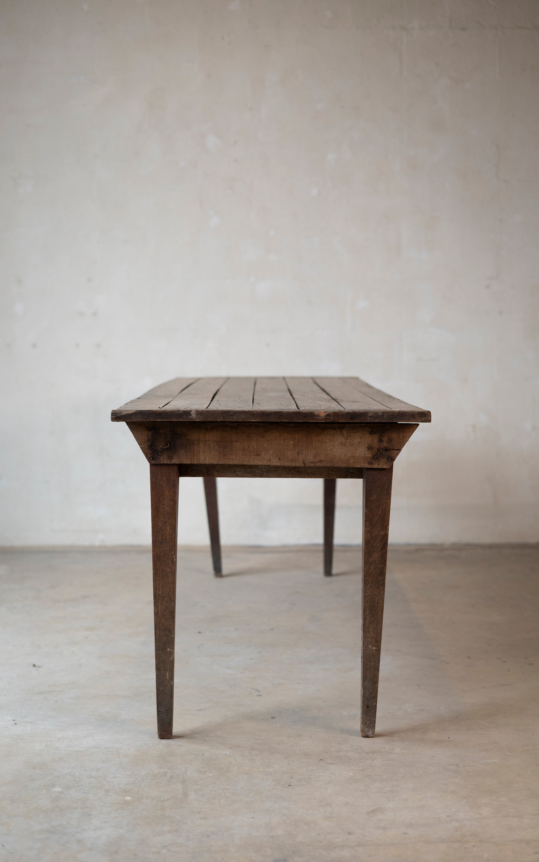 The table features a narrow, elegant silhouette supported by sturdy tapered legs. Its surface is a storied landscape of deeply weathered planks, bearing the authentic nicks and grain variations that only a century of use can produce. More than just a dining surface, it is a soulful artifact of French agricultural heritage, bringing a grounded, timeworn warmth to the modern home.