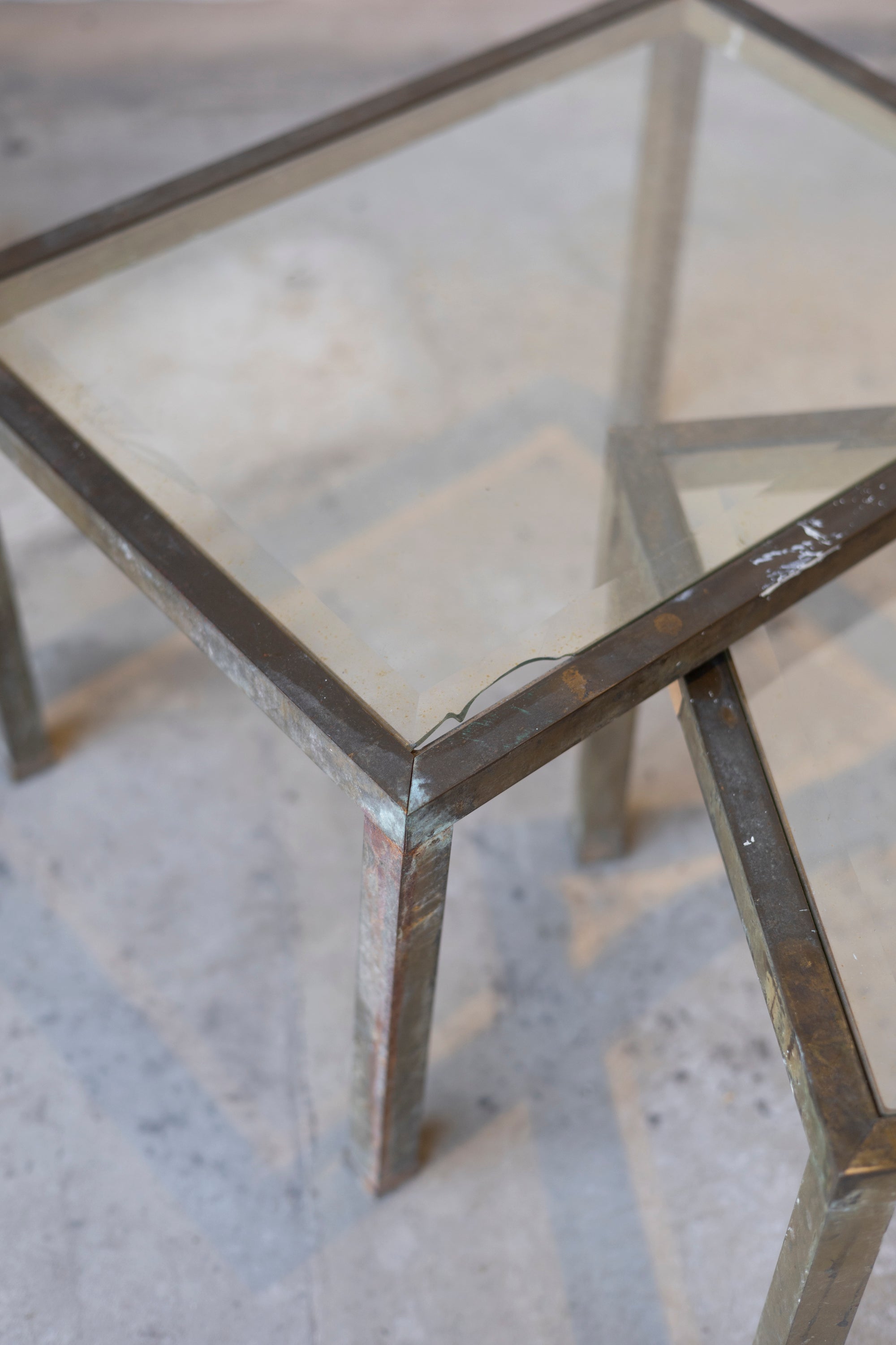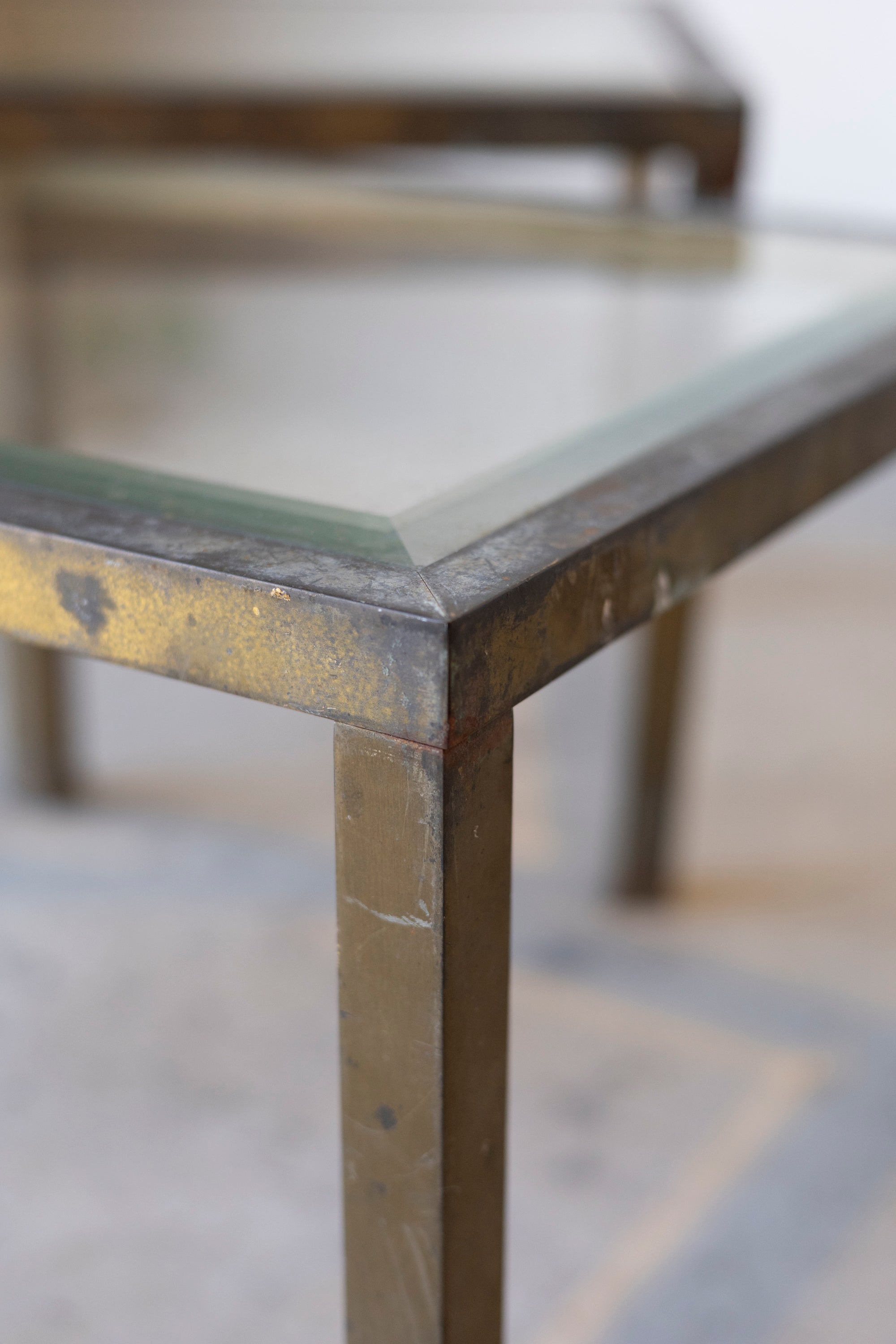 Sourced from Avignon, France, this set of nested side tables is a sophisticated example of early 20th-century design. Crafted from a refined pairing of glass and brass, the tables feature a sleek, minimalist silhouette characteristic of the first half of the century.