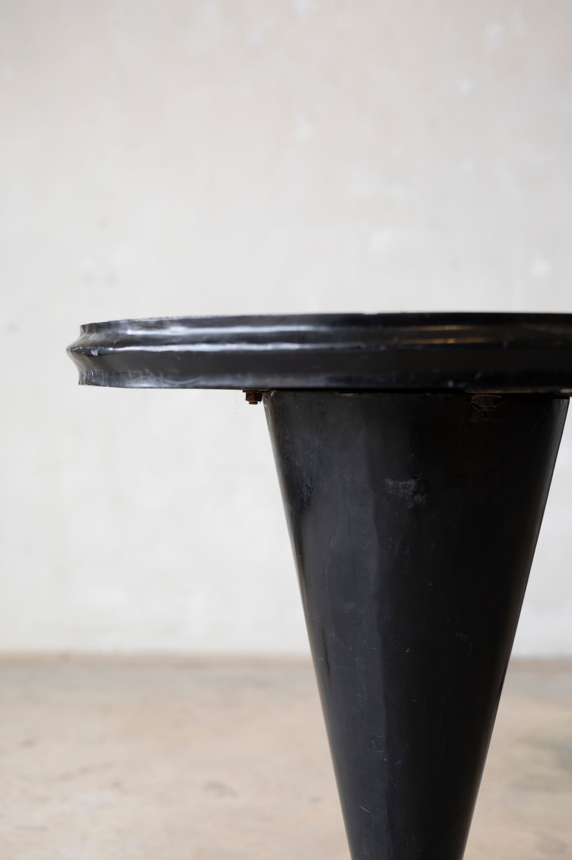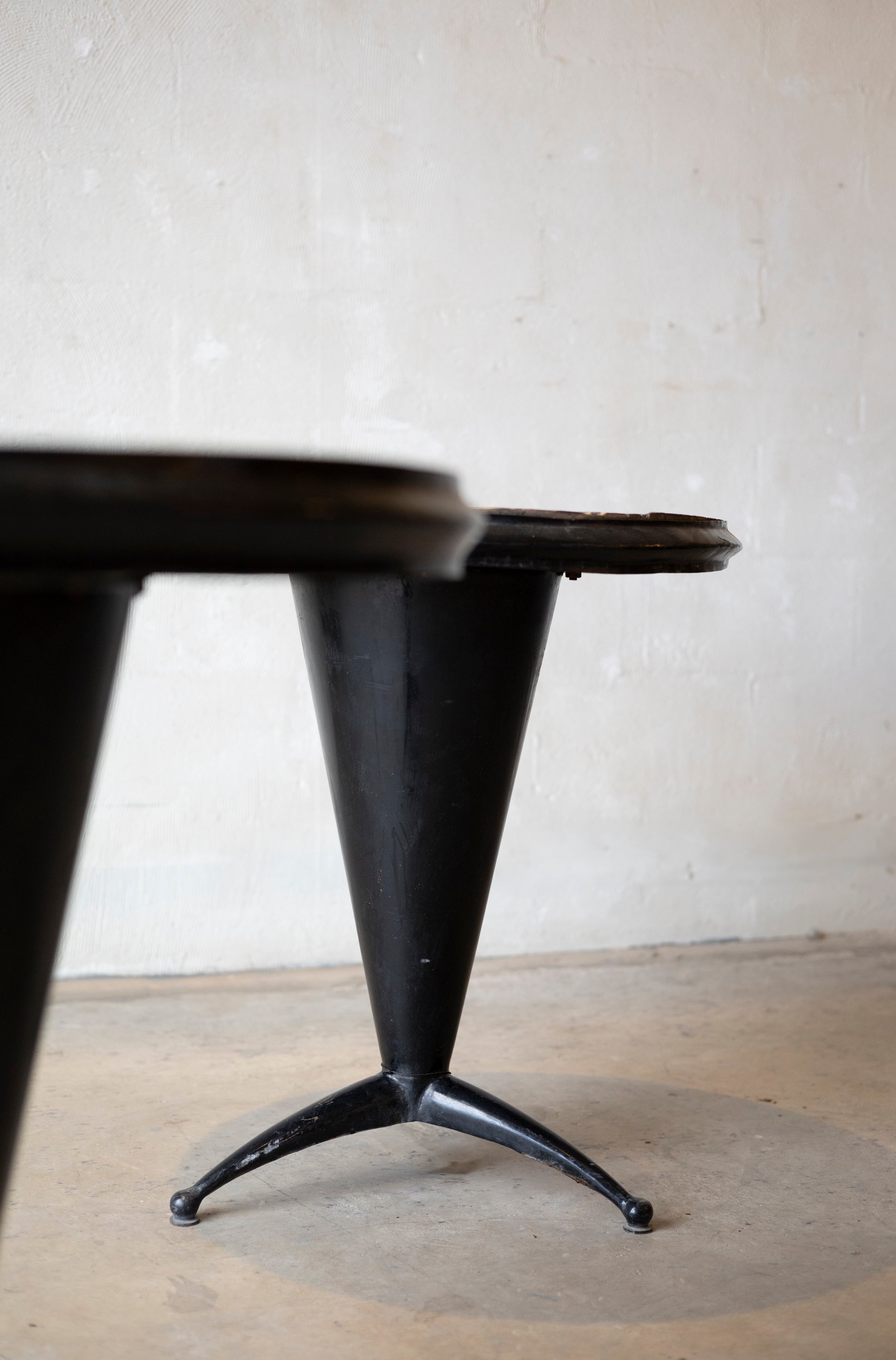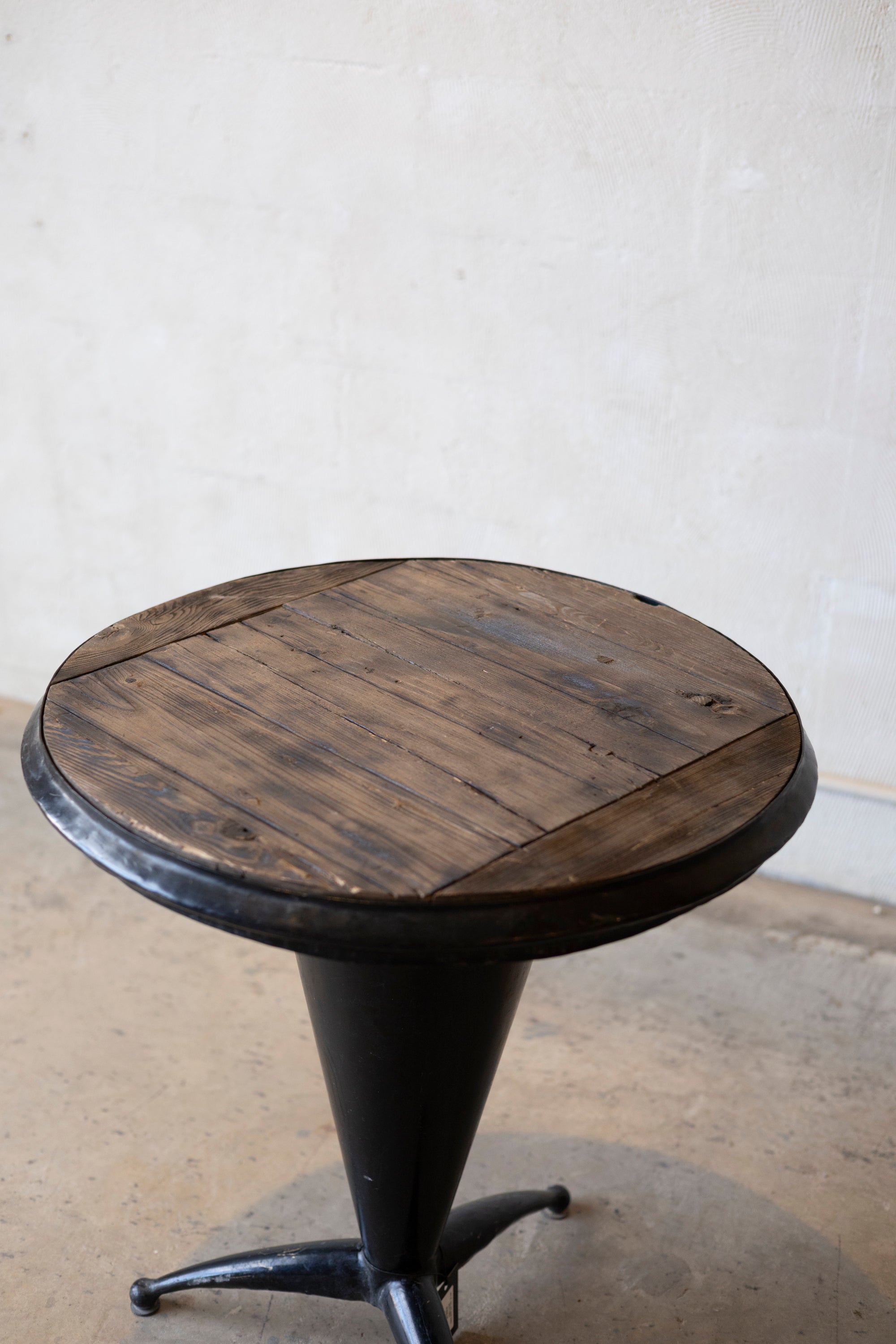 Sourced from Carpentras, France, these mid-century bistro tables offer a perfect balance of industrial strength and warm, organic texture. Dating to 1950, they reflect the clean, functional aesthetic of post-war French cafe culture.