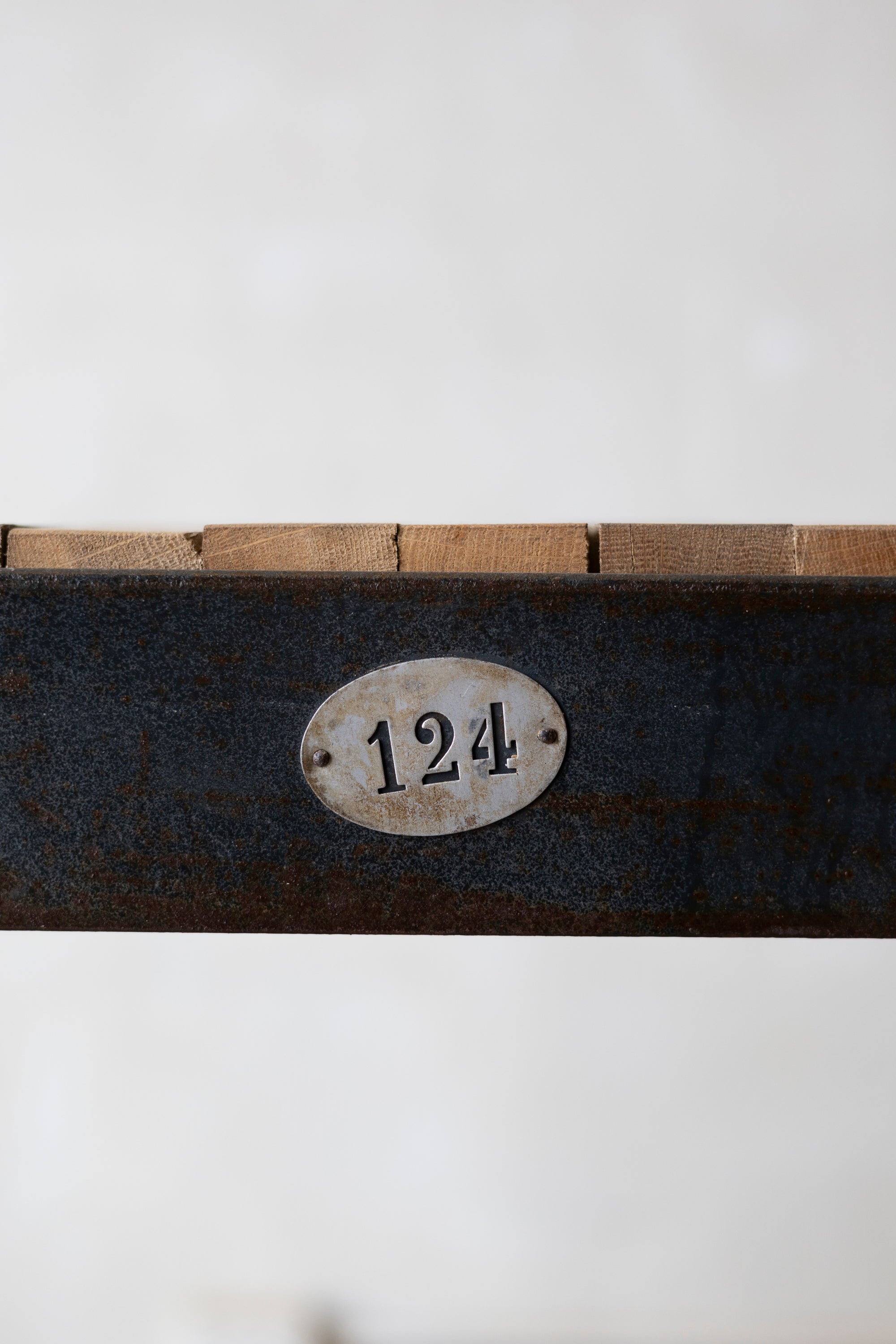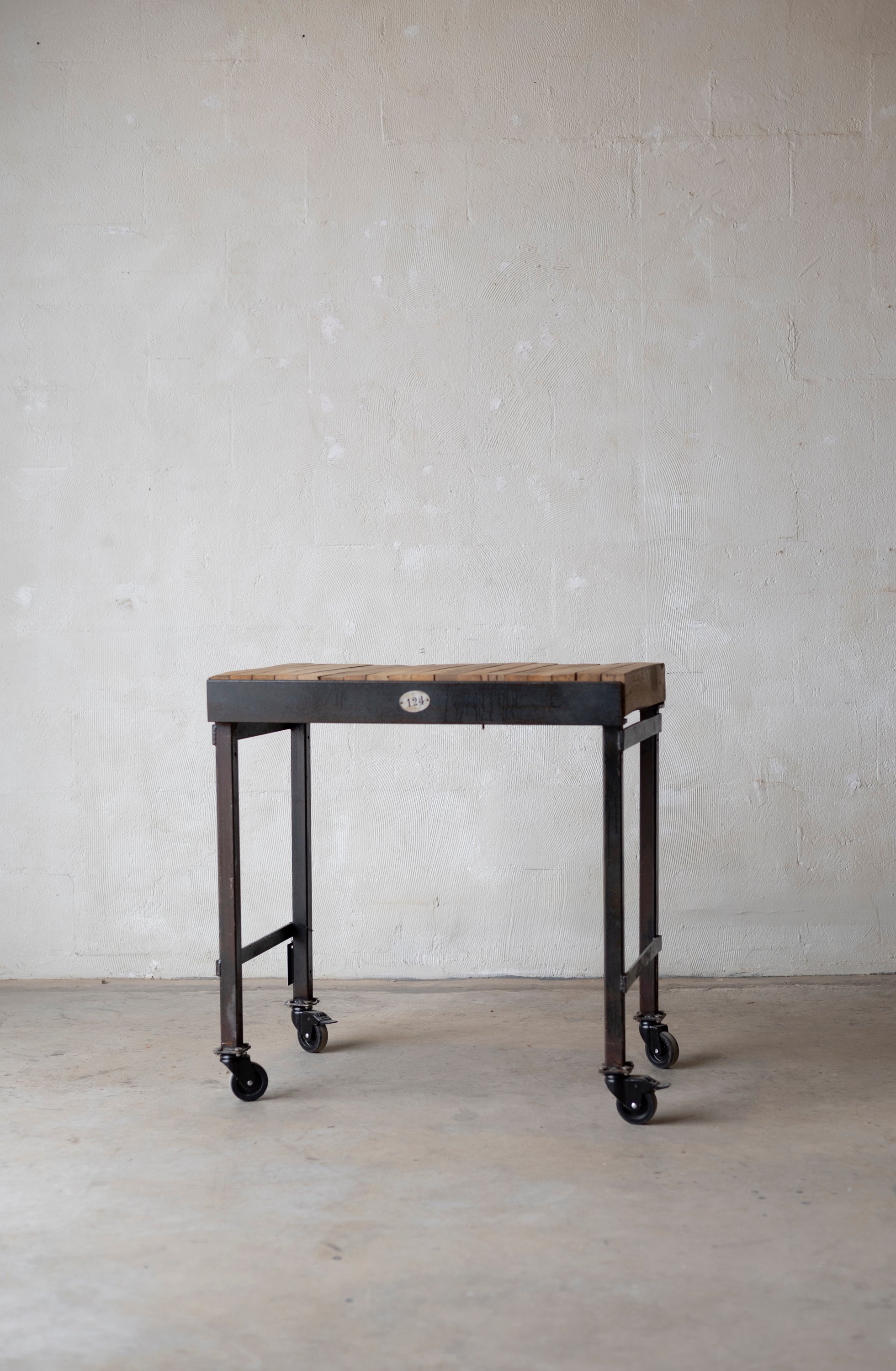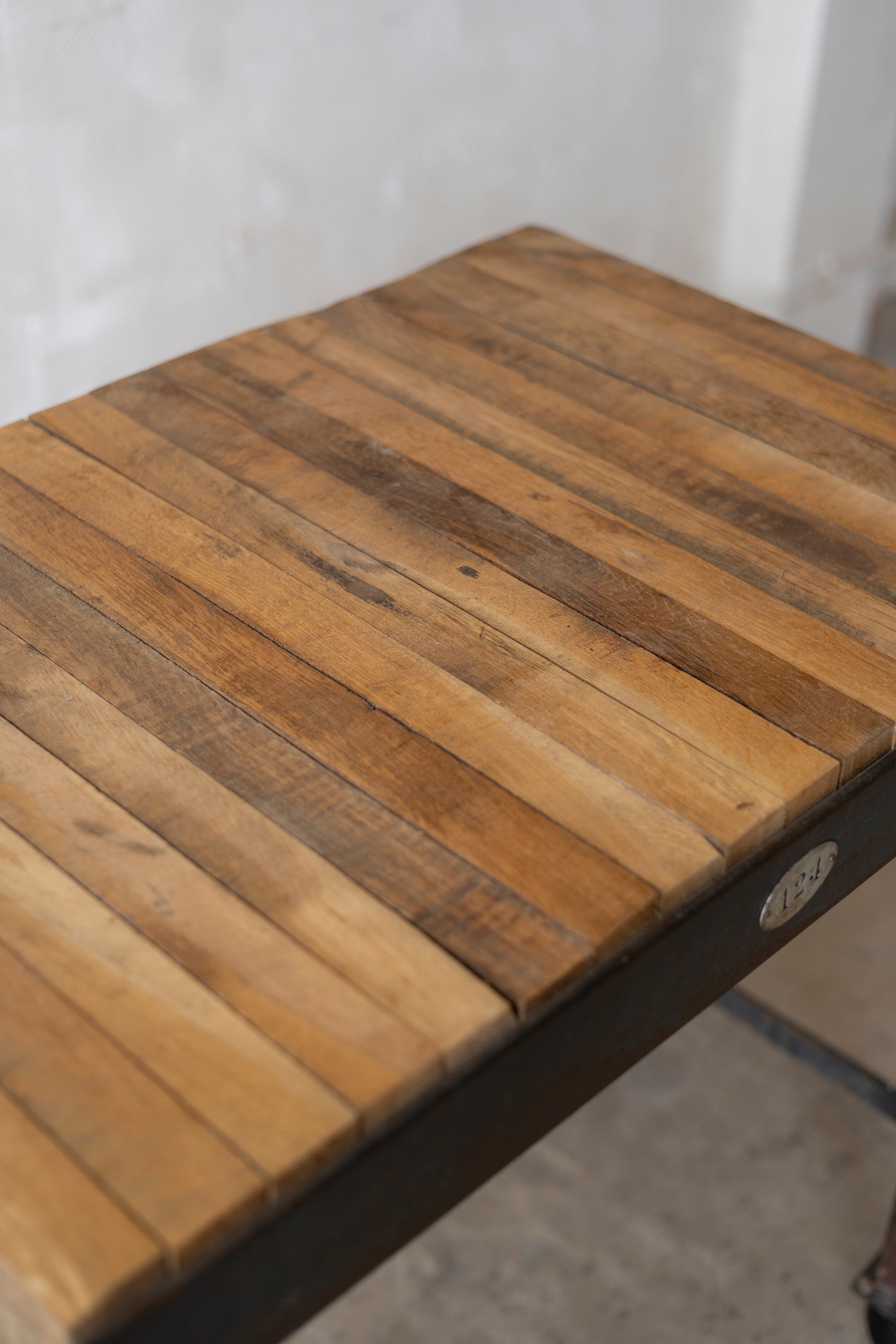 Constructed from solid oak slats, the piece features a rugged, ventilated surface and a sturdy frame built to withstand decades of heavy use. Its compact silhouette and original casters make it a perfect solution for a smaller kitchen, offering both additional workspace and a mobile, architectural focal point. With its deep, time-mellowed patina and honest construction, this table brings a piece of French industrial history into the modern culinary space.