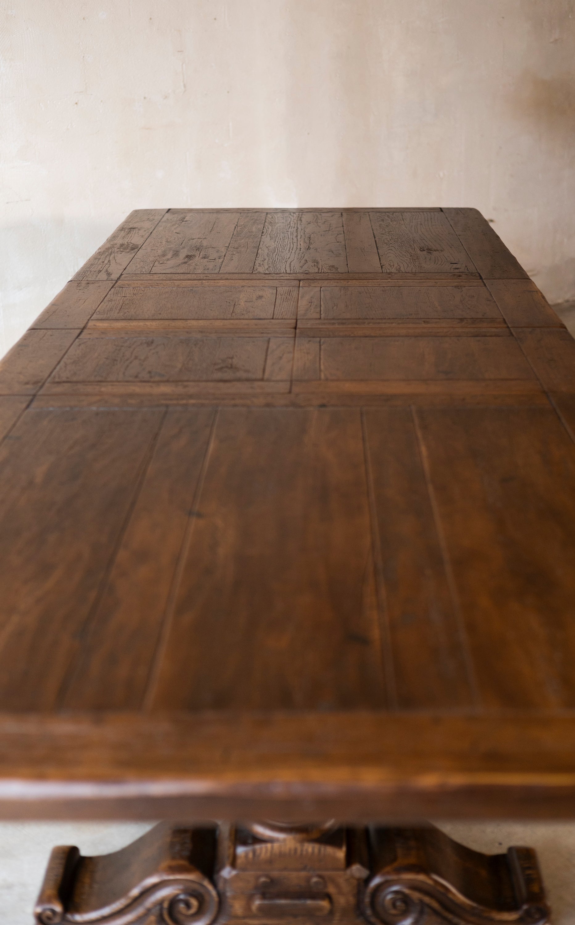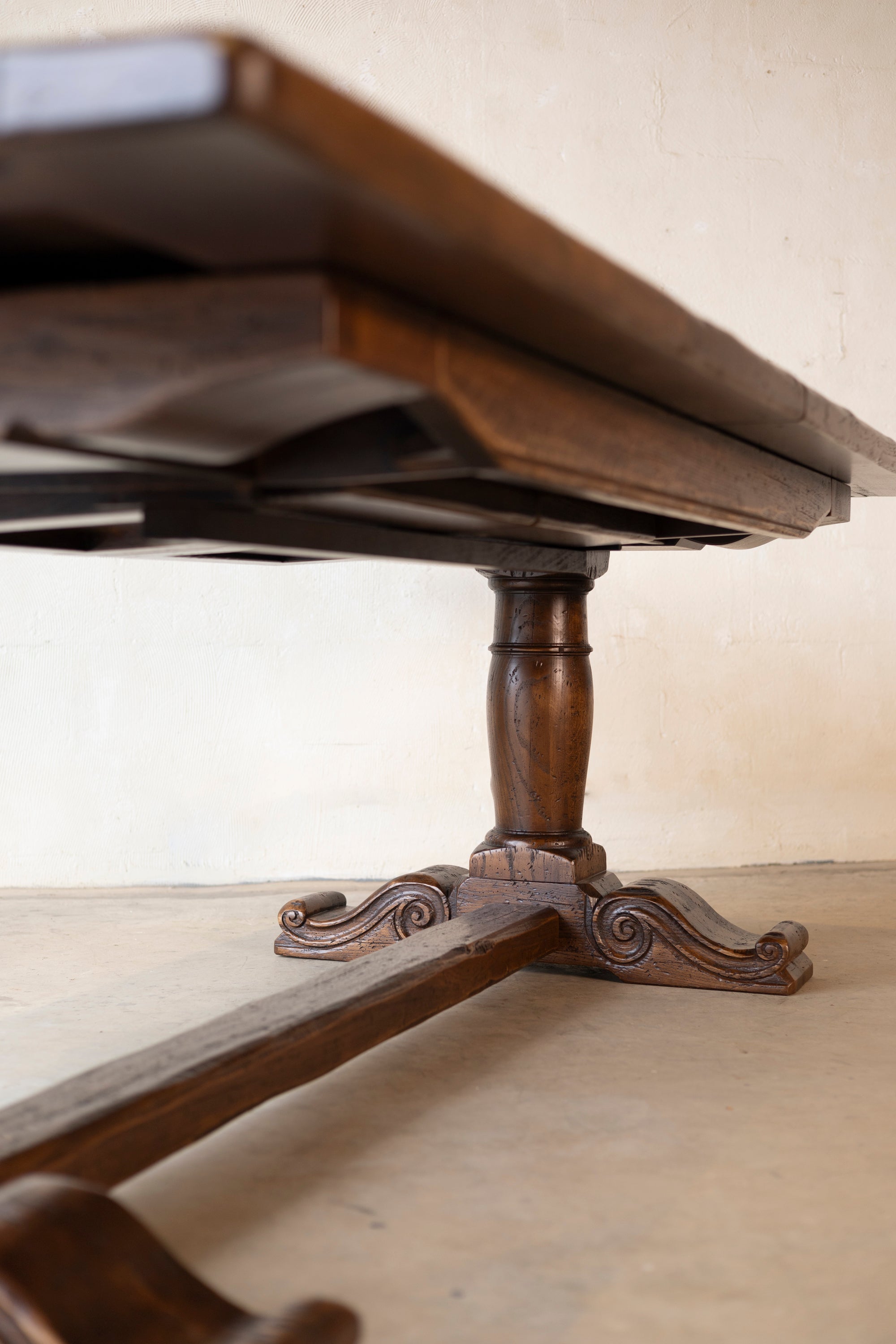 Designed to adapt to the changing rhythms of your home, the table features butterfly-leaf extensions that glide smoothly on precision runners. In its compact form, it comfortably seats 8, while fully extended, it becomes a grand gathering place for 14, or up to 16 for more festive, cozy occasions. With traditional joinery and hand-applied finishes that highlight the natural depth of the wood, this piece brings enduring strength and effortless utility to any dining space.